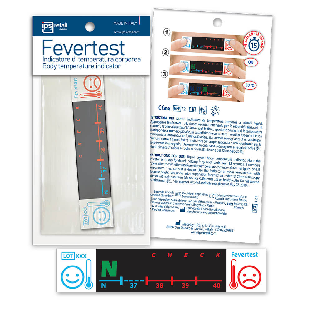 - Applicazione: Appoggiare Fevertest sulla fronte, tenendolo per le estremità.